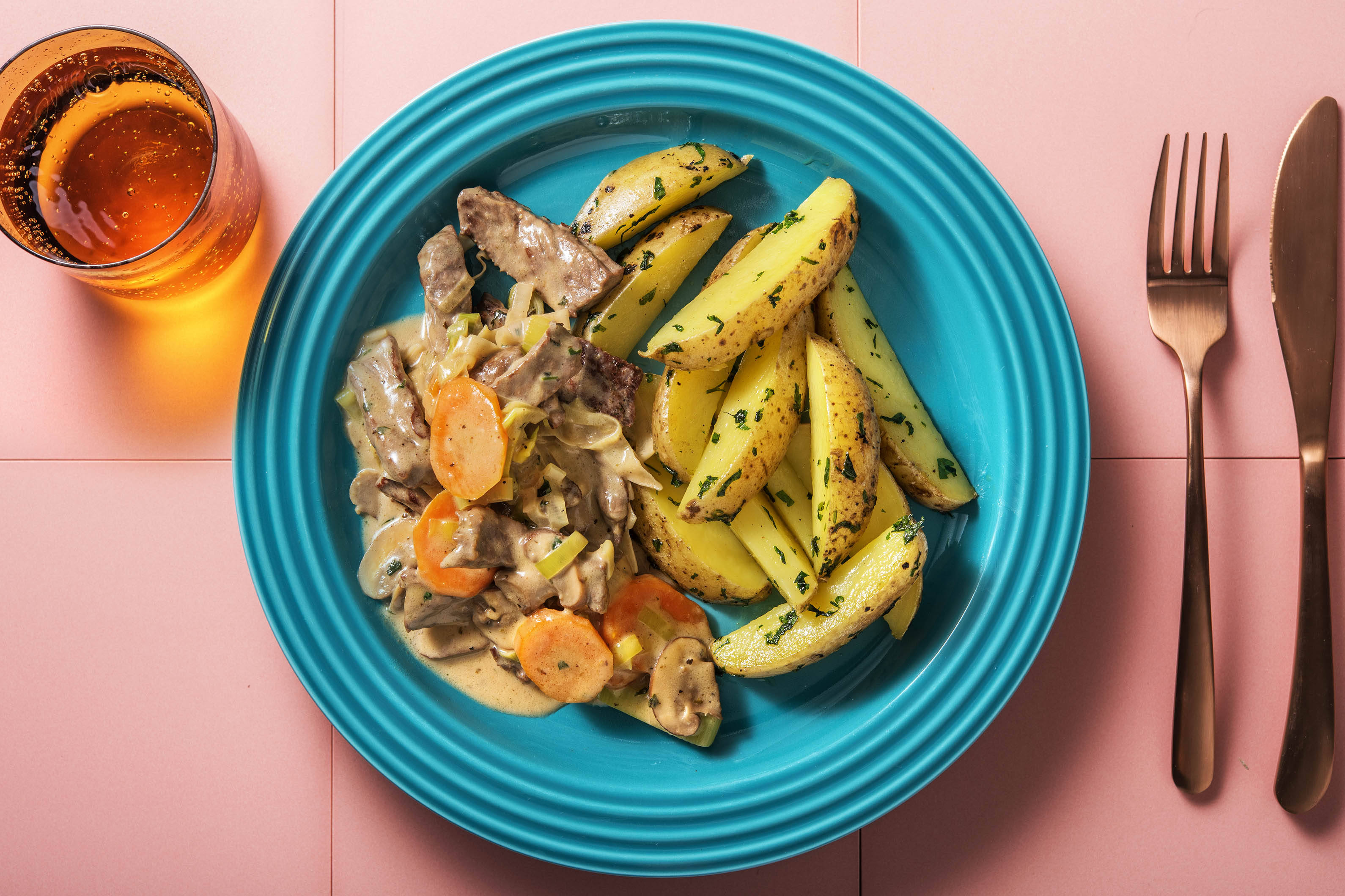 Gemüse mit restlicher Kochsahne, 50 ml [75 ml | 100 ml] Wasser* und Rinderbrühpulver ablöschen und einmal aufkochen.
