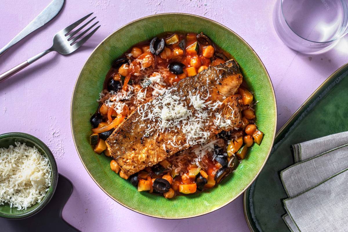 Gemüse auf Teller verteilen, mit Oliven toppen und mit geraspeltem Hartkäse garnieren. Fisch darauf anrichten und genießen. Guten Appetit!