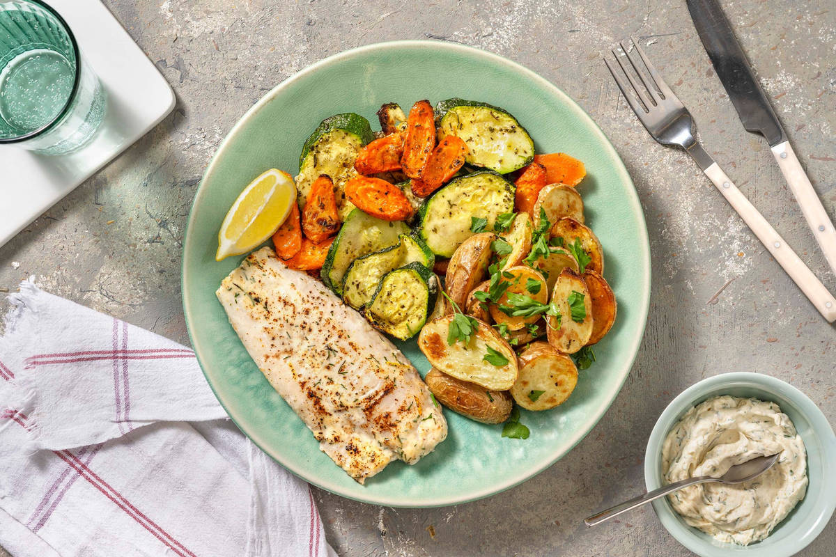 Fischfilets, Ofengemüse und Kartoffeln auf Teller verteilen. Petersilie über die Kartoffeln streuen und alles mit dem restlichen Dillschmand und Zitronenspalten genießen. Guten Appetit!
