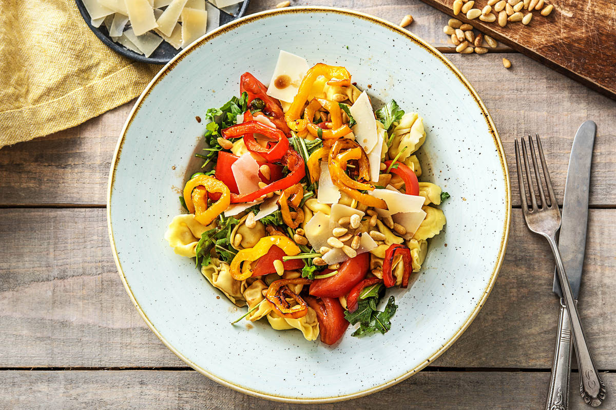 Mit diesem Rezept sparst Du clever Zeit beim Kochen: Paprikastreifen und Pinienkerne werden gemeinsam im Backofen gegart beziehungsweise geröstet. Erbsen und Tortellini werden gemeinsam im Topf gegart. Währenddessen musst Du lediglich ein Dressing anrühren und noch ein wenig schnippeln – fertig ist Dein sommerlicher Tortellini-Salat. Übrigens ist dieser auch ein perfektes Mitbringsel für eine Grillparty. Lass es Dir schmecken!