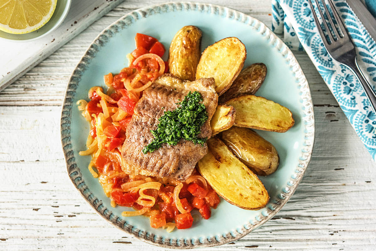 Zwiebel-Tomaten-Gemüse und Kartoffelhälften auf Teller anrichten. Welsfilet auf dem Gemüse verteilen, mit Petersilien-Zitronen-Öl beträufeln und zusammen mit Zitronenspalten genießen.