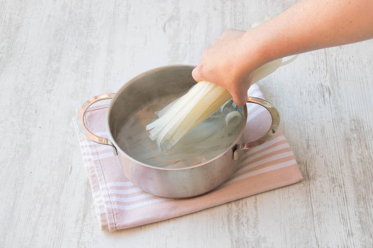 In einem großen Topf reichlich Salzwasser für die Reisnudeln erhitzen. Nudeln für 2 Min. darin kochen, dann abgießen und in einem Sieb abtropfen lassen.