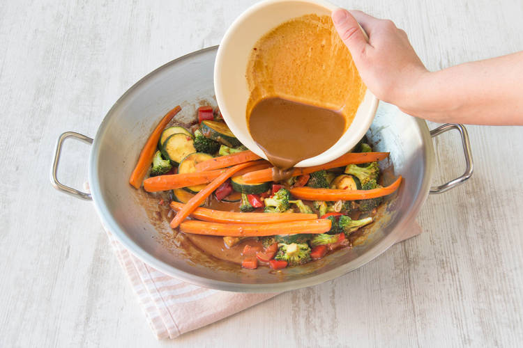 1 EL Öl in einer großen Pfanne (oder Wok) erhitzen. Sobald das Öl leicht raucht, Brokkoli, Karotte, Paprika und Zucchini 3–6 Min. darin anbraten. Weißen Teil der Frühlingszwiebeln dazugeben und ca. 2 Min. mitbraten. Sobald das Gemüse die gewünschte Konsistenz hat, mit der Kokosnuss-Erdnuss-Soße ablöschen und 2 weitere Min. einköcheln lassen.
