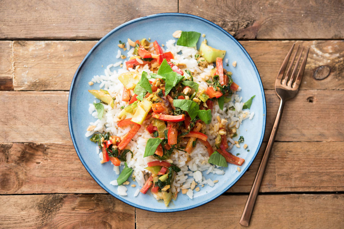 Basmatireis mit einer Gabel auflockern und auf Teller verteilen. Nuss-Gemüse-Pfanne darauf anrichten, mit Thai-Basilikum, grünen Frühlingszwiebelringen und gehackten Cashewkernen bestreuen.