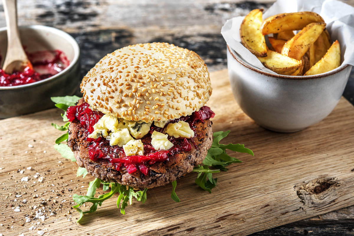 Brötchen mit Rucola und Bohnenpatty belegen. Mit Kirschchutney toppen.