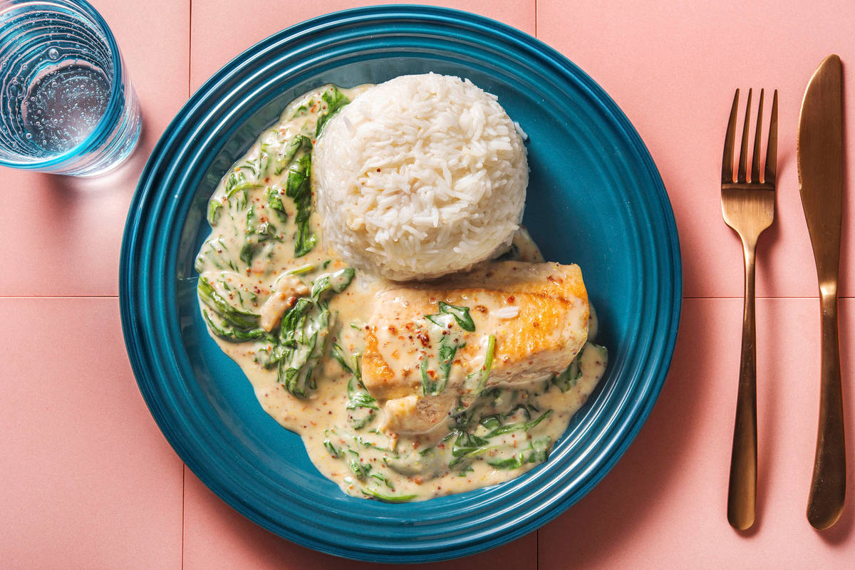 Babyspinat unter die Soße heben. Soße weiter erhitzen und Spinat zusammenfallen lassen. Soße mit Salz* und Pfeffer* abschmecken. Hitze weiter reduzieren.
