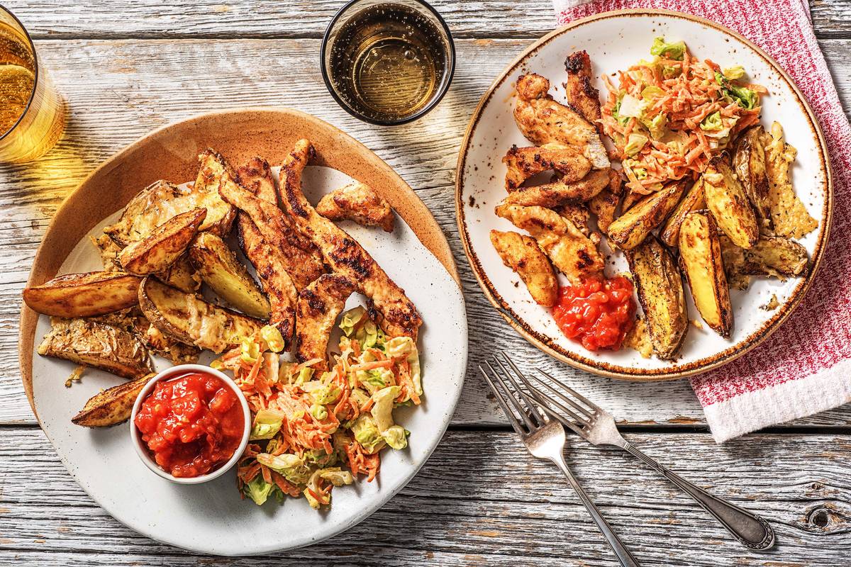 Hähnchenstreifen zusammen mit dem Ketchup, Kartoffelspalten und Salat servieren.