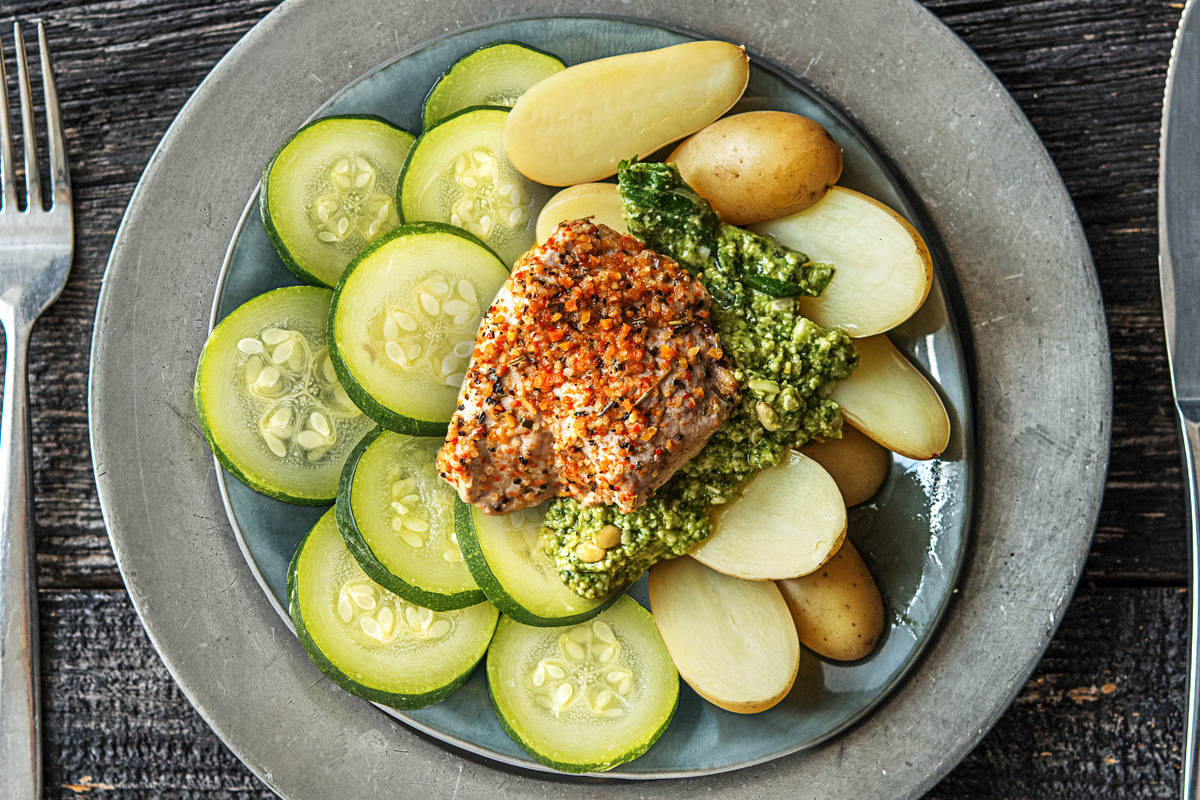 Varoma absetzen und Gareinsatz mit dem Spatel herausnehmen. Kartoffelhälften und Zucchinischeiben auf Teller verteilen. Pesto und Schweinefilet darauf anrichten und genießen.