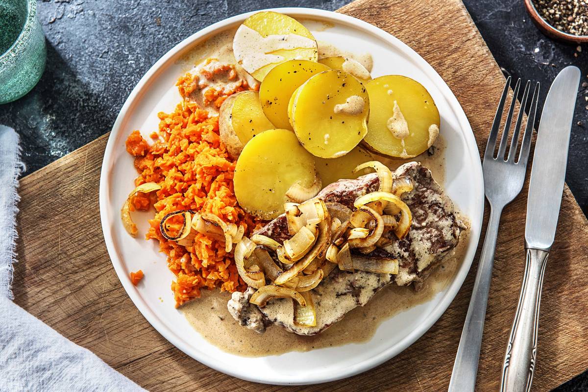 Mit diesem deftigen Zwiebelrostbraten bringen wir Dir heute einen richtig urigen Klassiker auf den Tisch. Hierfür kombinierst Du ganz einfach zartes Rinderhüftsteak mit leckeren gebratenen Zwiebelringen. Dazu gibt es knusprige Ofenkartoffeln und einen erfrischenden Karottensalat. Guten Appetit!